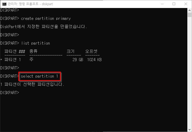 8. select partition 1 을 입력해 생성한 파티션을 선택합니다.