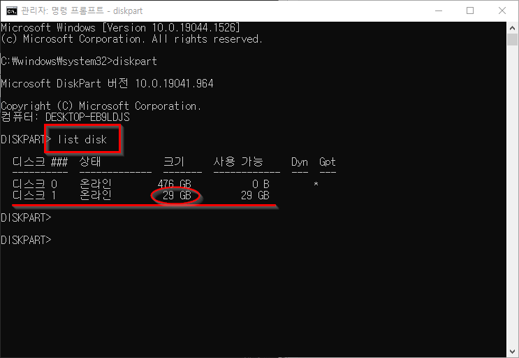 USB와 비슷한 용량을 확인하면 쉽게 해당하는 디스크(USB) 번호를 확인할 수 있습니다.