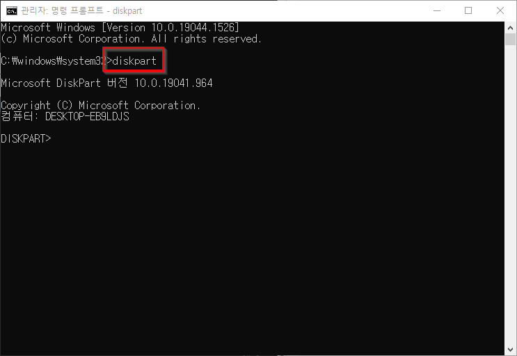 2. diskpart 를 입력합니다.