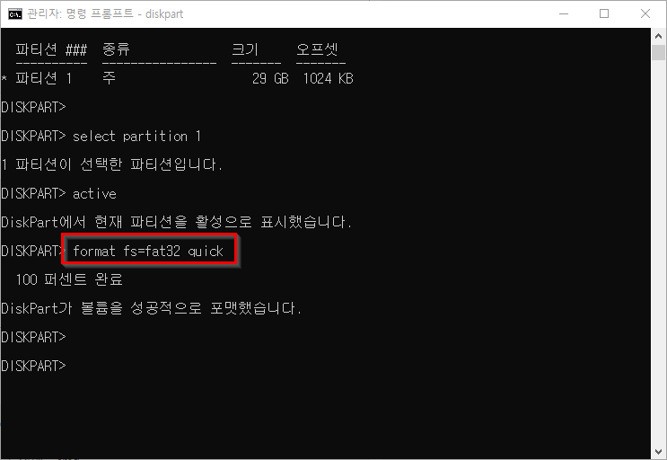 fat32로 포맷을 원하는 경우 format fs=fat32 quick 를 입력하고,