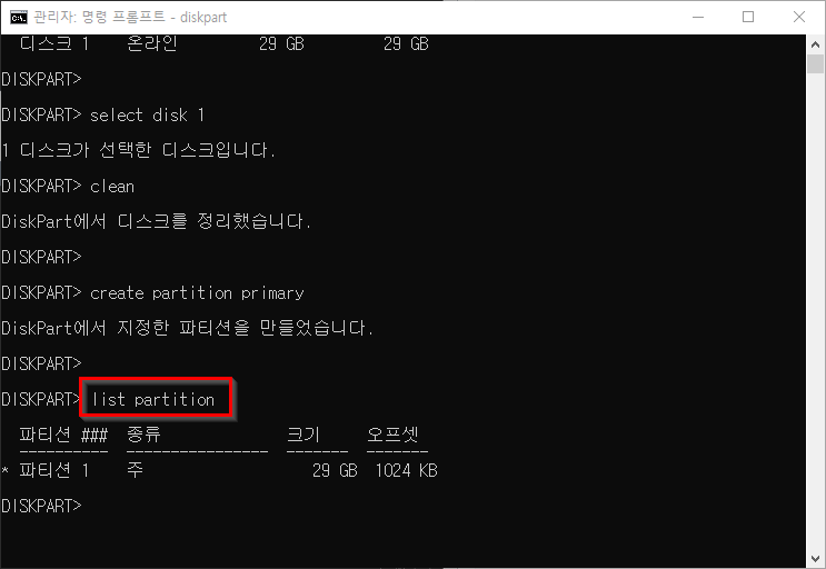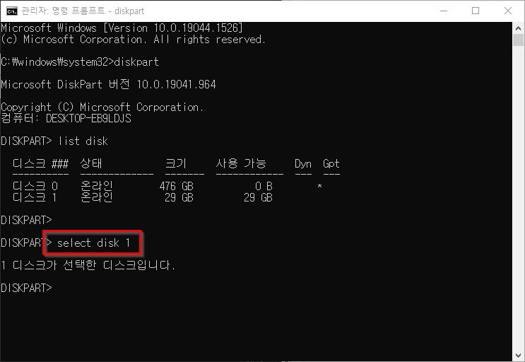* <number>에는 list disk에서 확인한 USB 디스크의 번호를 입력합니다. ex) select disk 1