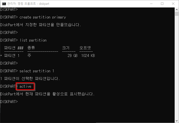 9. active 를 입력하여 파티션을 활성화합니다.