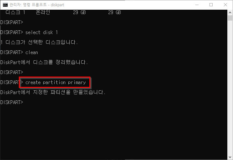 6. create partition primary 를 입력하여 파티션을 생성합니다.