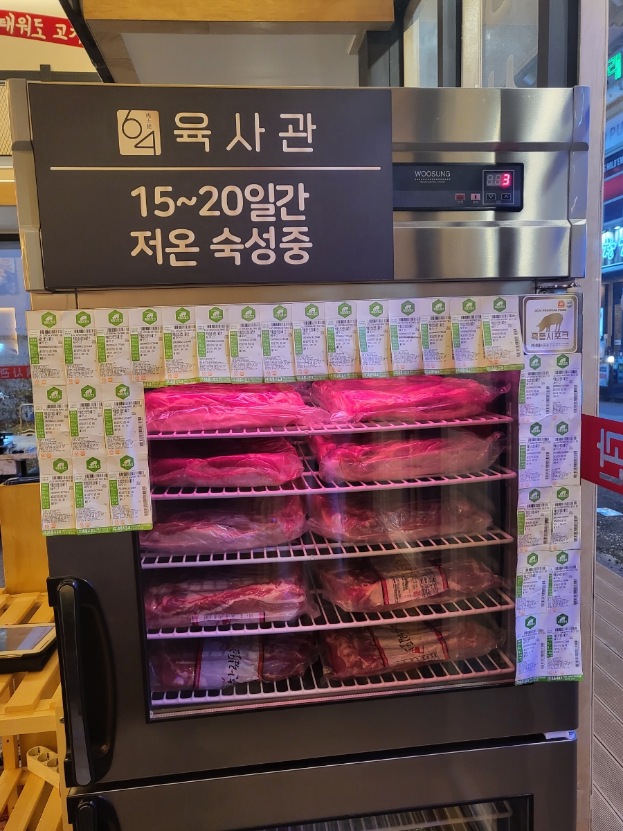 매장에 들어서면 저온 숙성중인 고기들을 볼 수 있어요.