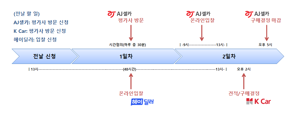 - AJ셀카: 평가사 방문을 1일차(다음 날)의 편한 시간에 예약합니다.