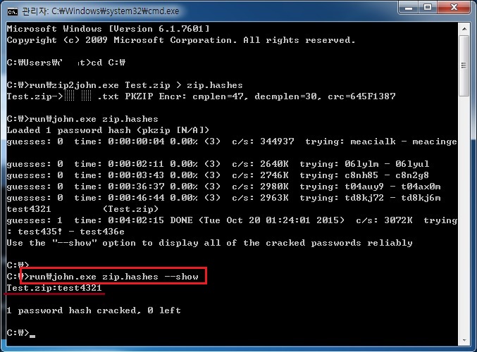 8. 다시 간단하게 확인하려면 아래 명령어를 이용합니다. >run\john.exe zip.hashes --show