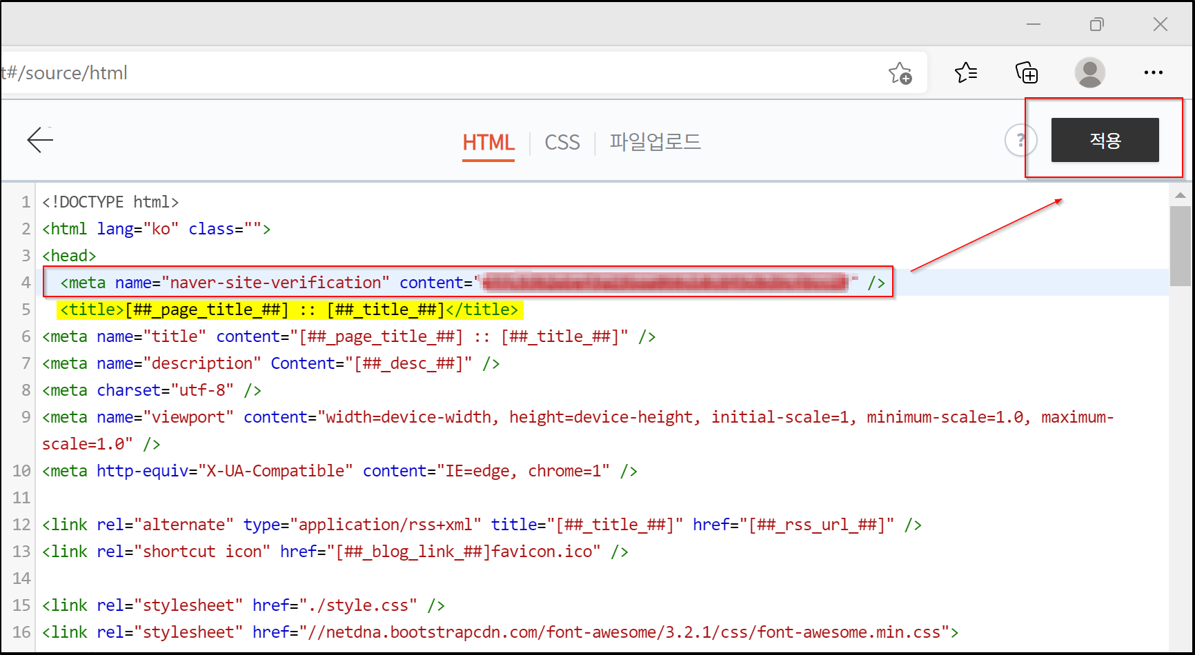 6. <title> 태그 윗 부분에 복사한 <meta> 태그를 붙여넣습니다.