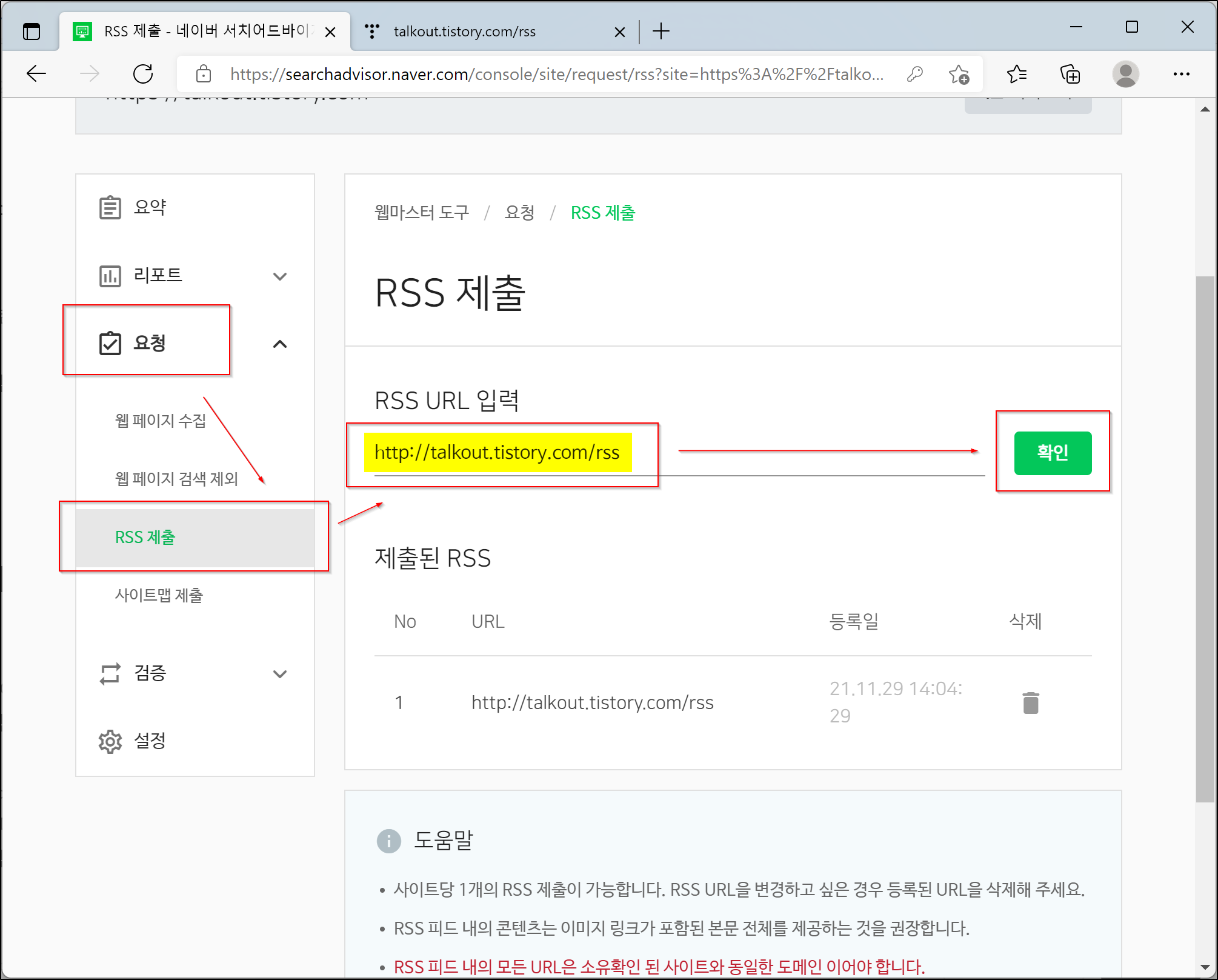 2. 요청 > RSS 제출 > 티스토리 블로그 RSS 주소 제출