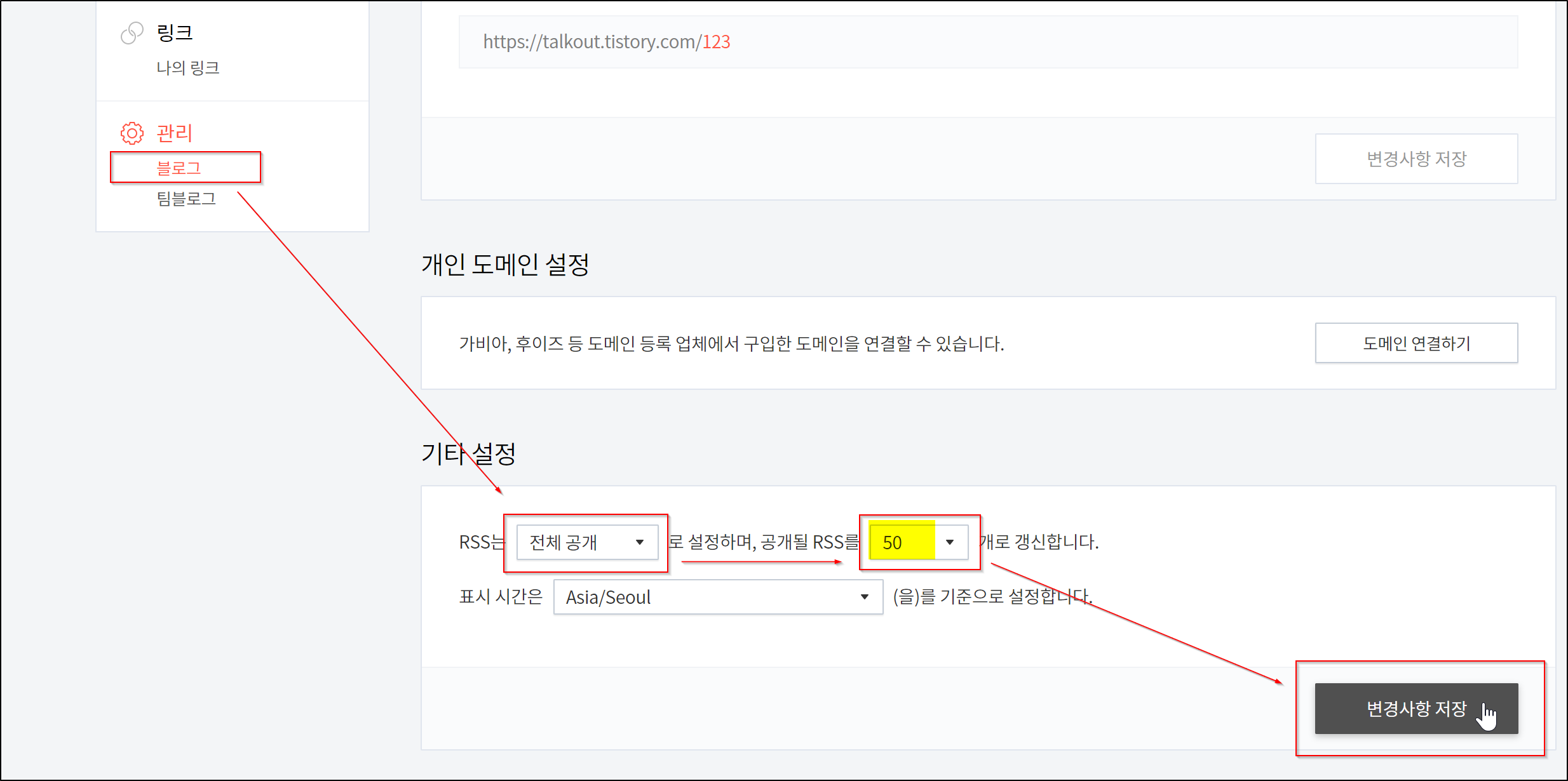 - RSS 설정을 '공개'와 '50'으로 설정합니다.