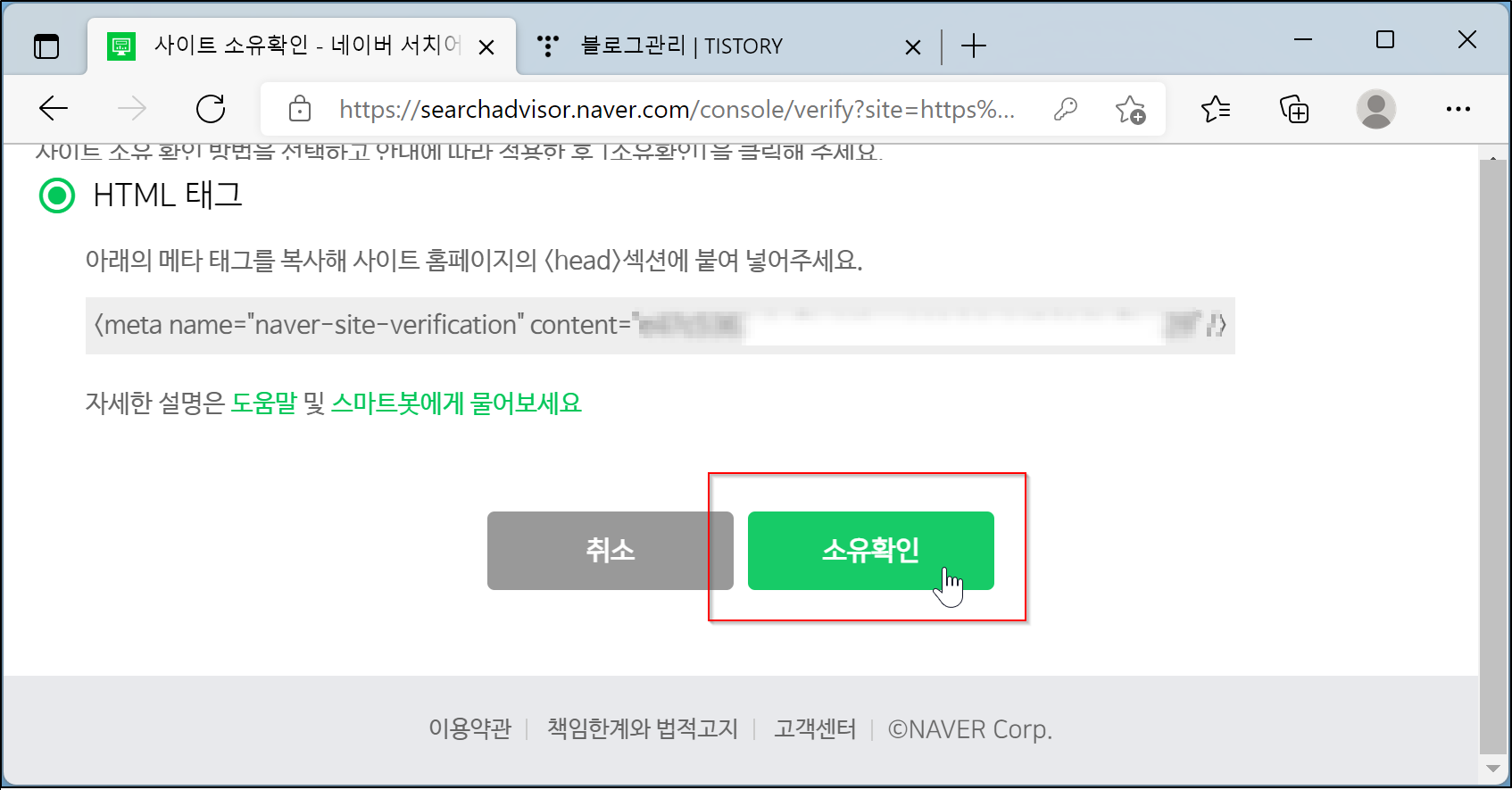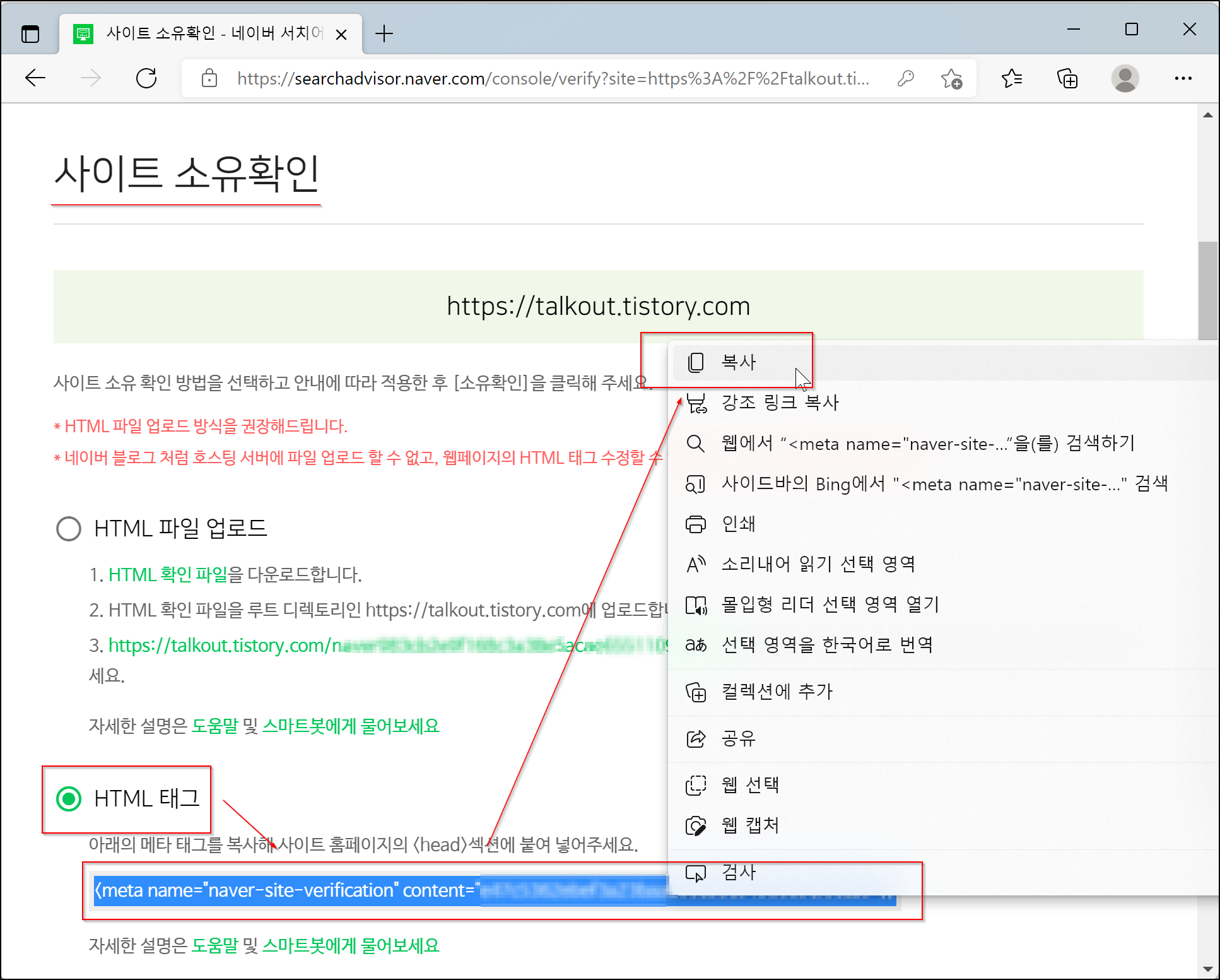 4. 사이트 소유확인 > HTML 태그 > 복사