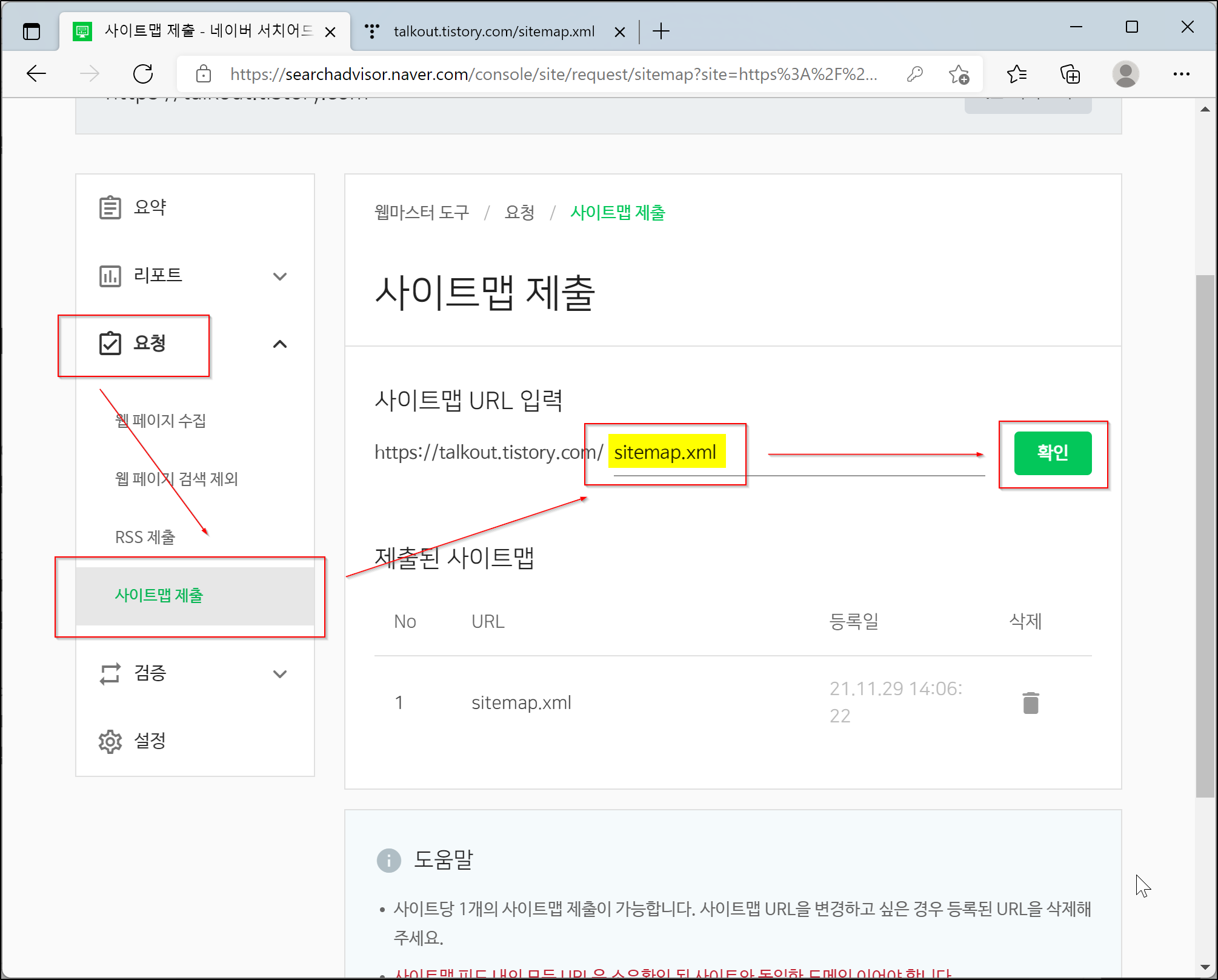 3. 요청 > 사이트맵 제출 > 티스토리 블로그 SiteMap 주소 제출