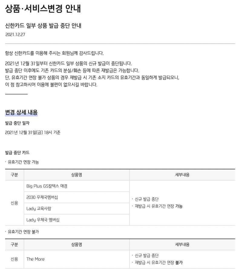 신한카드 The More 카드 발급 중단 일자 : 2021년 12월 31일(금) 18시 기준