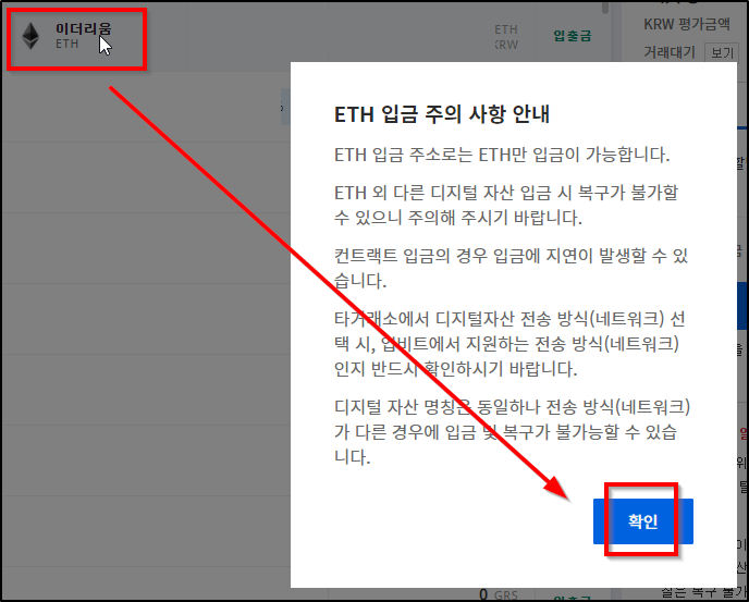 3. 이더리움 코인을 선택하고, 확인을 클릭합니다.