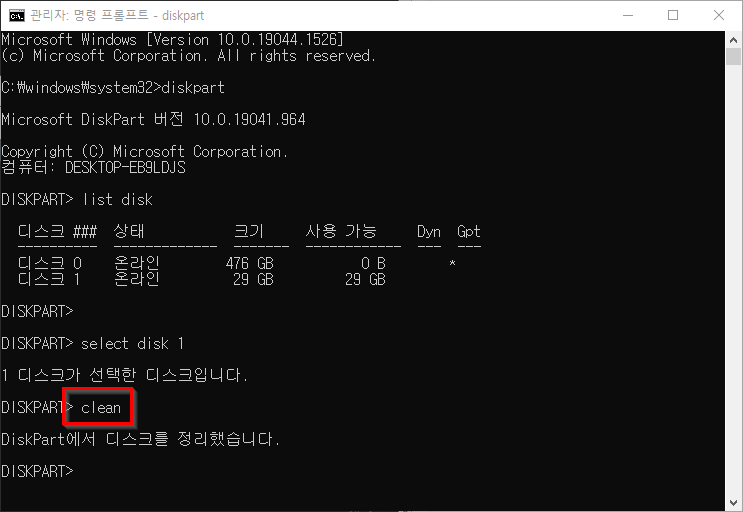 * <number>에는 list disk에서 확인한 USB 디스크의 번호를 입력합니다. ex) select disk 1